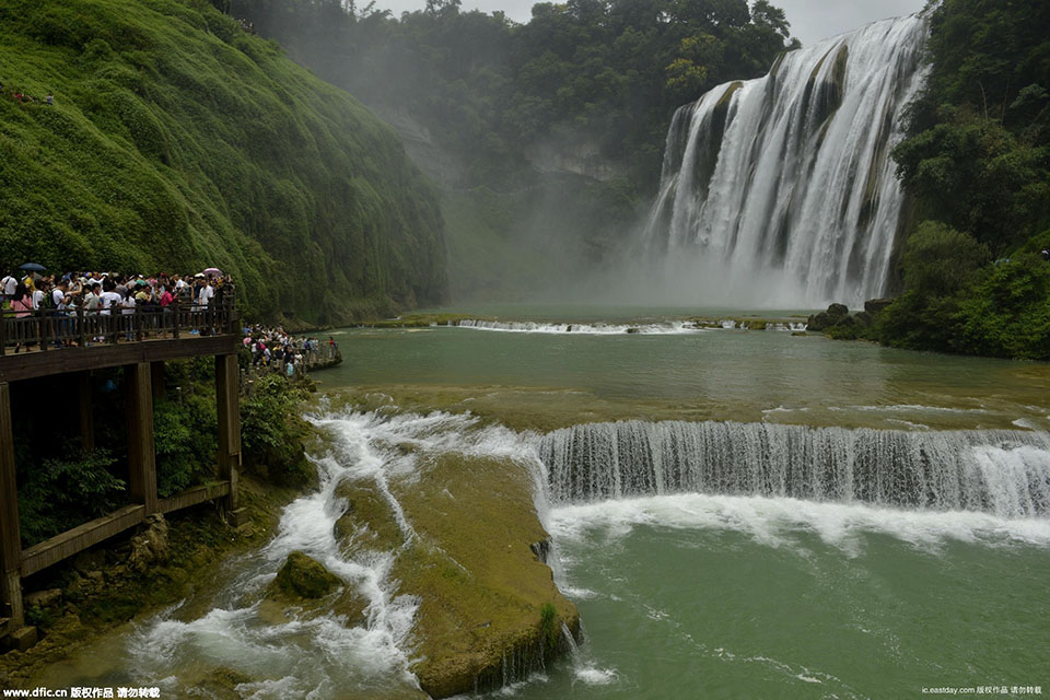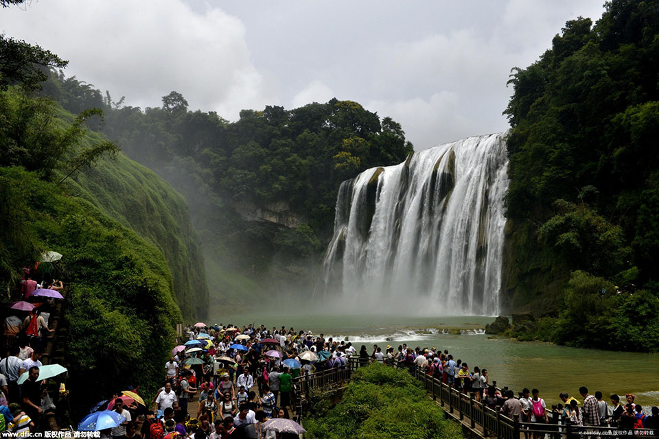 2015年7月29日,贵州黄果树景区,前来观瀑的游客爆满。进入雨季后,贵州降雨增多,著名的黄果树瀑布在丰水期飞流直下,气势磅礴。壮美的大瀑布下,前来观赏瀑布的游人如织。夏季是贵州的传统旅游旺季,每年进入7月起,贵州即迎来传统旅游旺季,各地游客纷纷涌入贵州避暑纳凉。特别是黄果树大瀑布由于水量充沛,瀑布飞流直下,蔚为壮观,景区游人如织,呈现“人海看瀑布”的壮观景象。