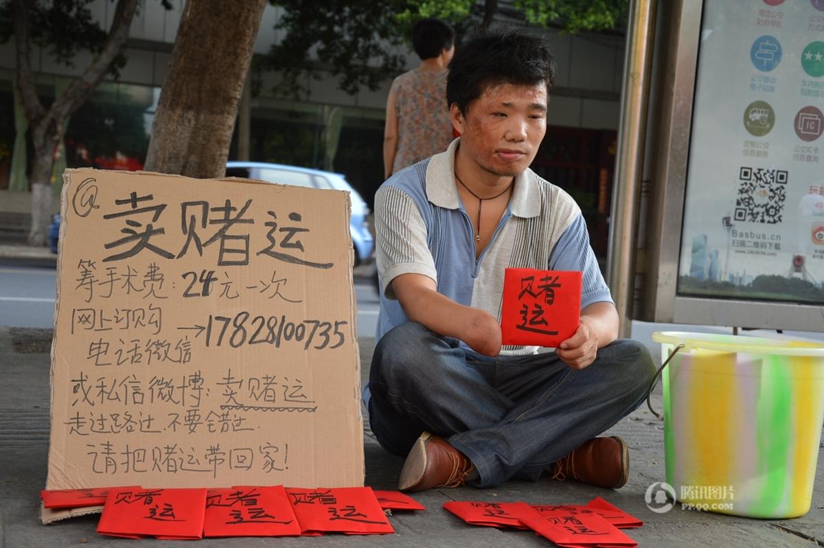 2015年8月4日,四川成都,武侯区浆洗街附近的一共公交站旁,一名男子“卖赌运”的行为吸引了众多路人的目光。该名男子称,想卖出自己的“赌运”,凑集手术费用。范冬/CFP