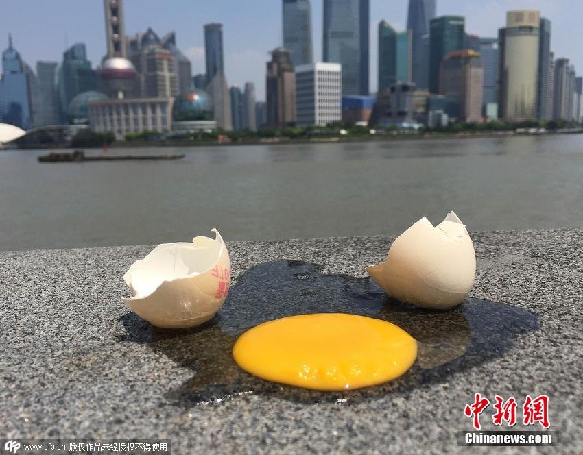 8月4日,连续高温第十天,据上海气象局发布的数据显示,最高气温39.2℃,热出今夏新高度。上海外滩观光平台的石块护栏上,打开一个鸡蛋,约一刻钟已被煎成六分熟。