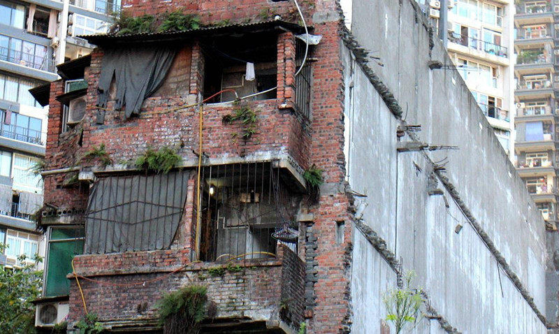 海外网8月4日电 8月4日,重庆南岸区大石坝,一栋四层小楼的侧墙被斩断,裸露着钢筋,孤零零伫立在路边。据悉,该房屋产权人拒绝拆迁,开发商将周围房屋拆除后留下的场景,本是20几个门面构成的房屋现在仅仅剩下1个门面位置,业主继续经营着这家小旅馆,成为“楼薄薄”,被市民称作“最牛钉子旅馆”。