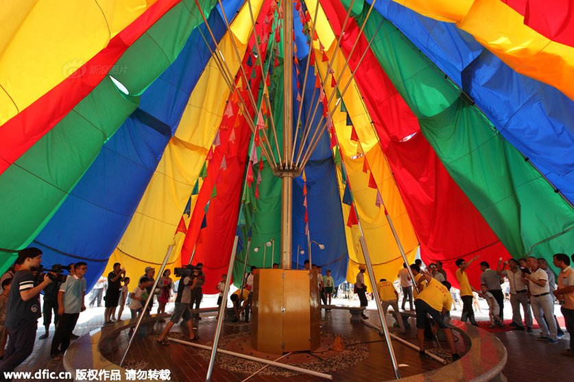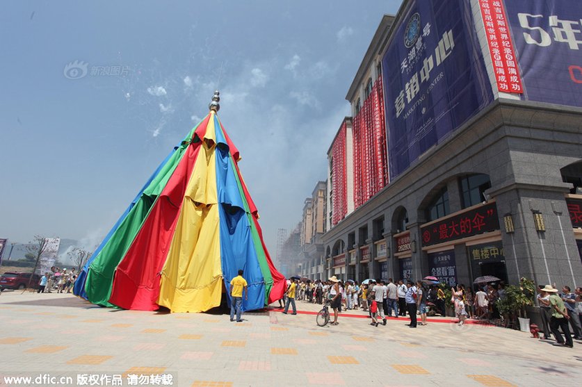 8月3日,江西省星子县在勤德文化广场举行“挑战吉尼斯世界记录现场会”,418平方米巨伞创吉尼斯世界纪录。