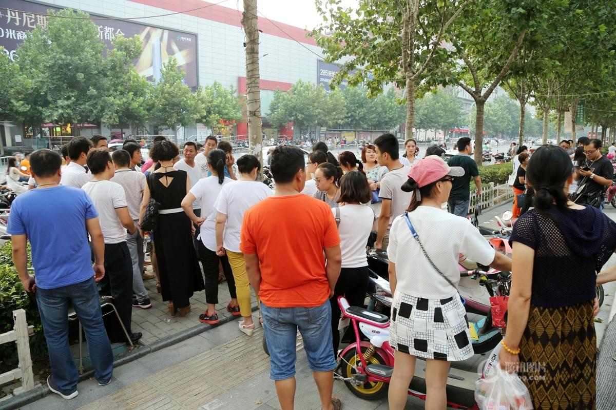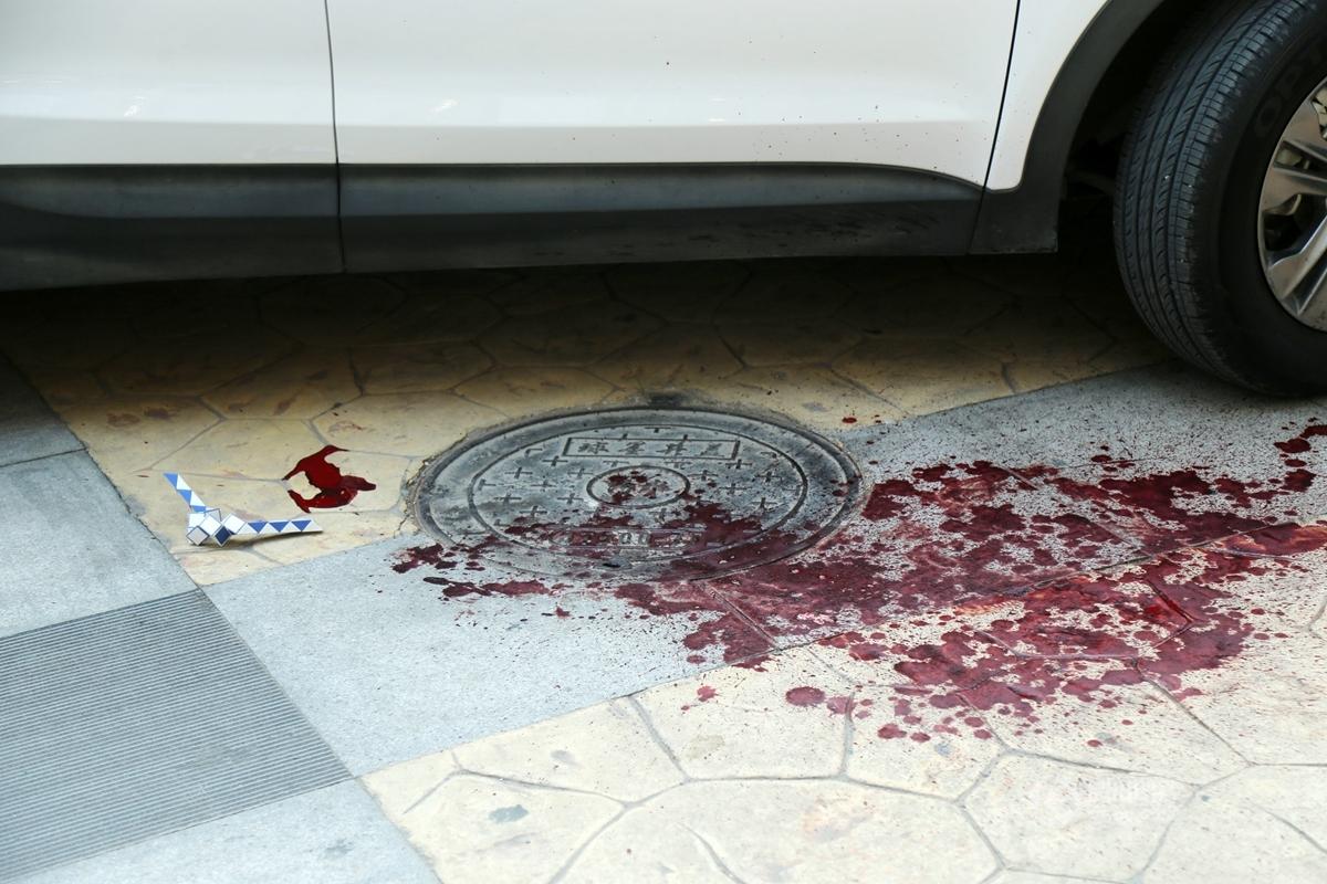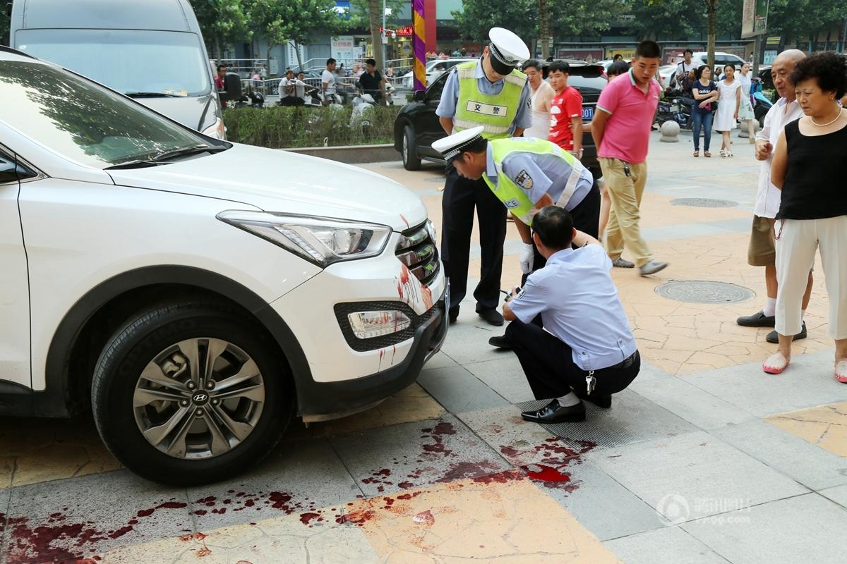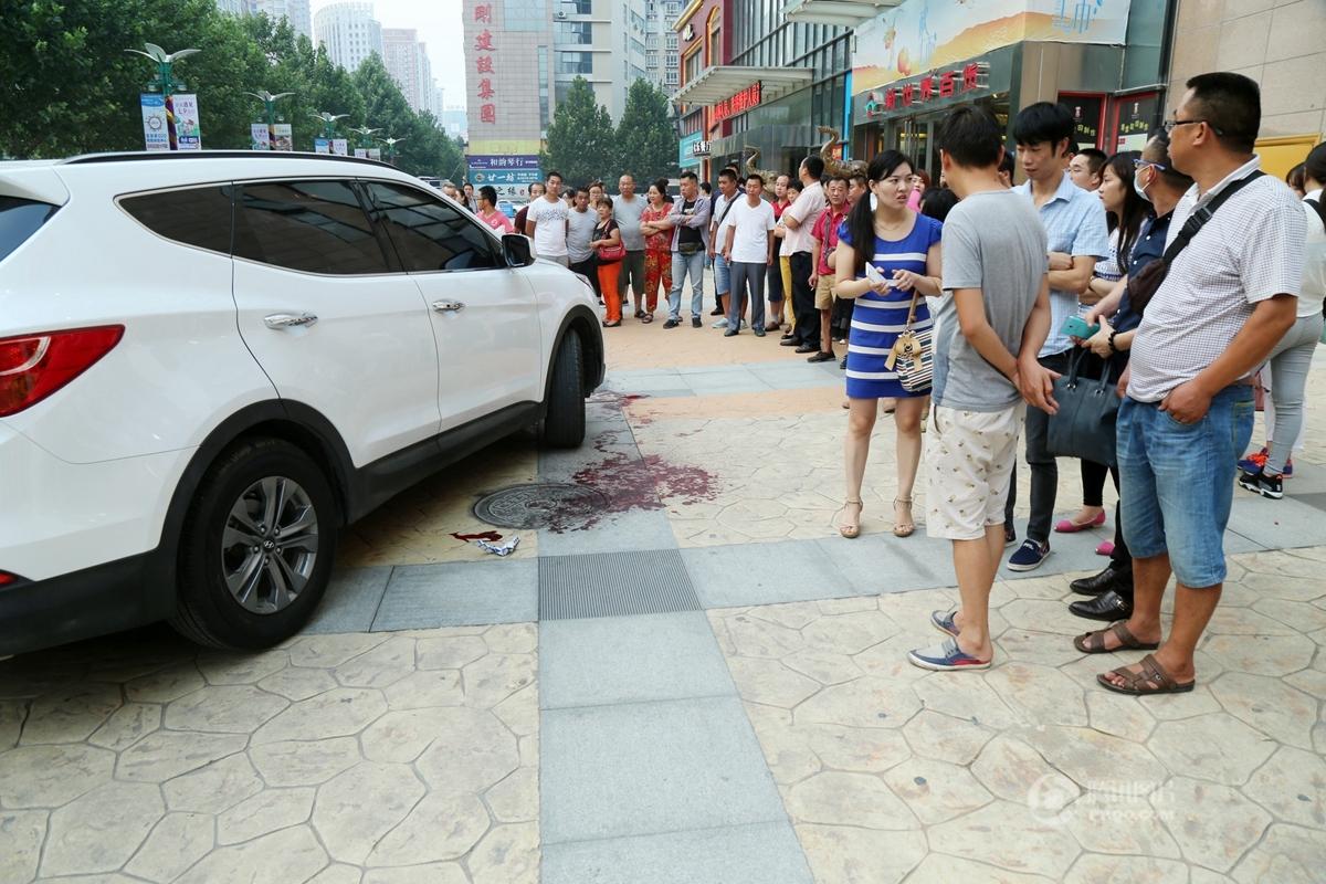 昨天下午,郑州紫荆山路与硝滩街交叉口的新世界百货商场门前,一辆白色现代SUV车斜着停在商场前的人行道上,车子右前轮下有大片血迹。众多市民们围在一起,讨论着刚发生不久的惨祸。