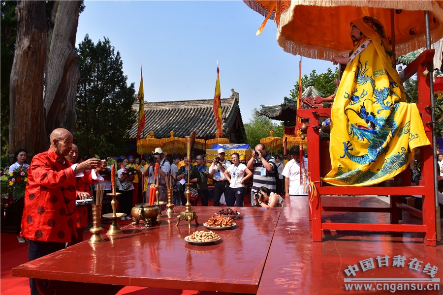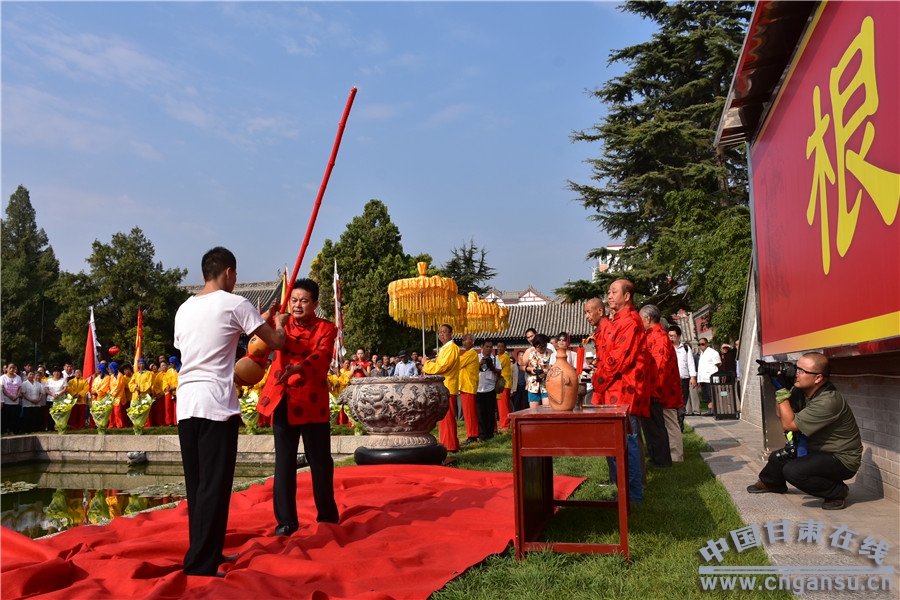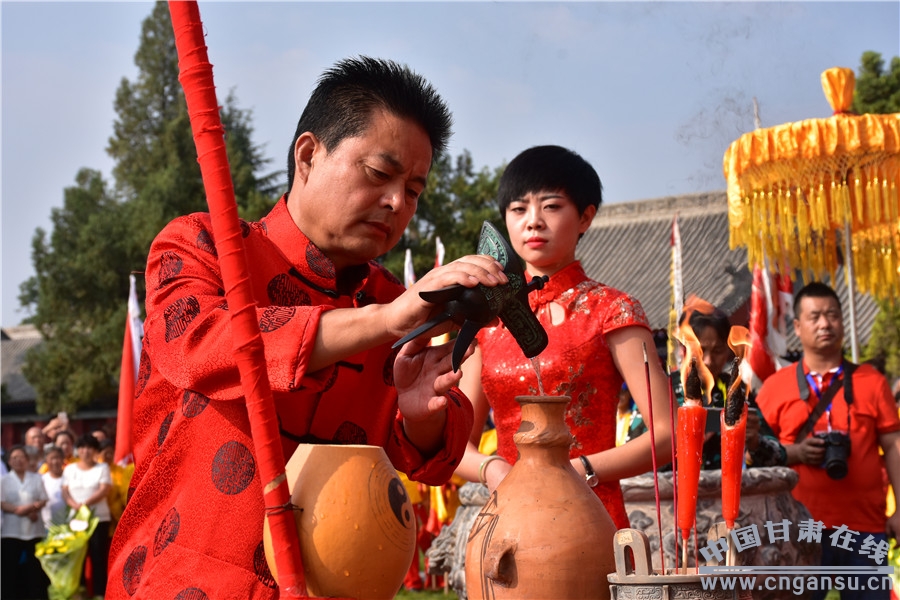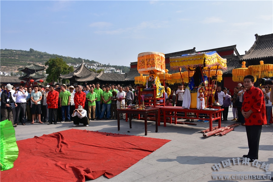 仪式开始后,请方神黑爷进入伏羲庙,在先天殿月台表演《神人畅》后,在伏羲身泮池取圣水,最后在先殿月台举行明烛、焚香、化表、献茶仪式;随后,在伏羲庙西牌坊前举行焚榜文仪式,将榜文、告文、祭文之灰送往藉河长流水中。