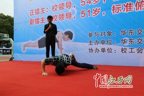 两脚并拢,双手撑地,华东交大分管体育工作副校长张玉清做起了标准的俯卧撑,立下擂台。“29、30……94、95……”、“加油、加油”。在现场,同学为擂台赛的老师学生鼓劲呐喊。当天上午,有学生创造最高记录100个,挑战成功的师生占据比赛人数的三分之二。