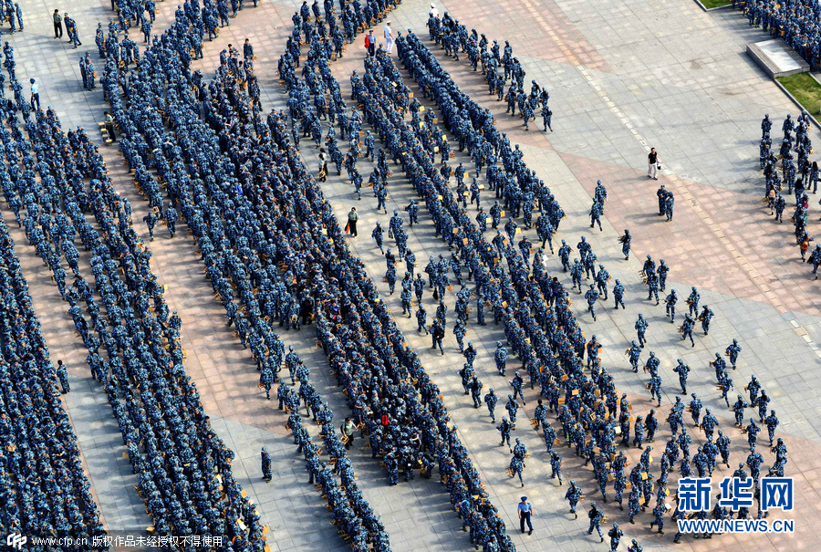 2015年9月14日,湖北武汉,当日上午,武汉理工大学2015级本科生开学典礼暨军训动员大会在该校南湖校区举行,全校多个校区约9000名新生身着迷彩戎装一起进行军训,场面震撼壮观。南湖校区现场集合了约7000名新生参与军训,队列整齐、英姿飒爽,热情投入军训,开启了朝气蓬勃的大学新生活。图片来源:cfp
