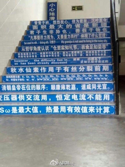 【霸气!四川一中学楼梯现最牛横条!】为高考拉各种横幅已经out了!网曝成都崇庆中学的楼梯上,每级台阶都贴上了很实用的各类学科基本知识点、必记词条,方便学生们熟记。以后,同学们不仅在教室里可以学习,走个楼梯也能学习了……