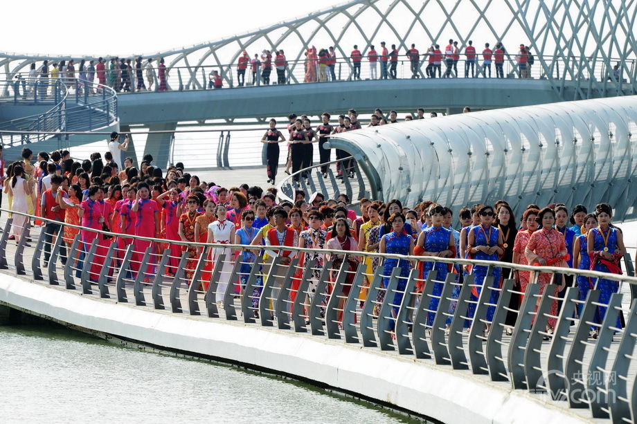 2015年10月17日,江苏省苏州市吴江区苏州湾,来自香港、澳门、日本、墨尔本、柬埔寨、北京、山东、青海、辽宁等中国旗袍会全球各个分会的52个团体在太湖阅湖台参加了一场千人水上走秀,虽未打破今年5月17日青岛1300余人同穿中国传统旗袍最多人数的记录,但却见证旗袍与太湖的完美结合。