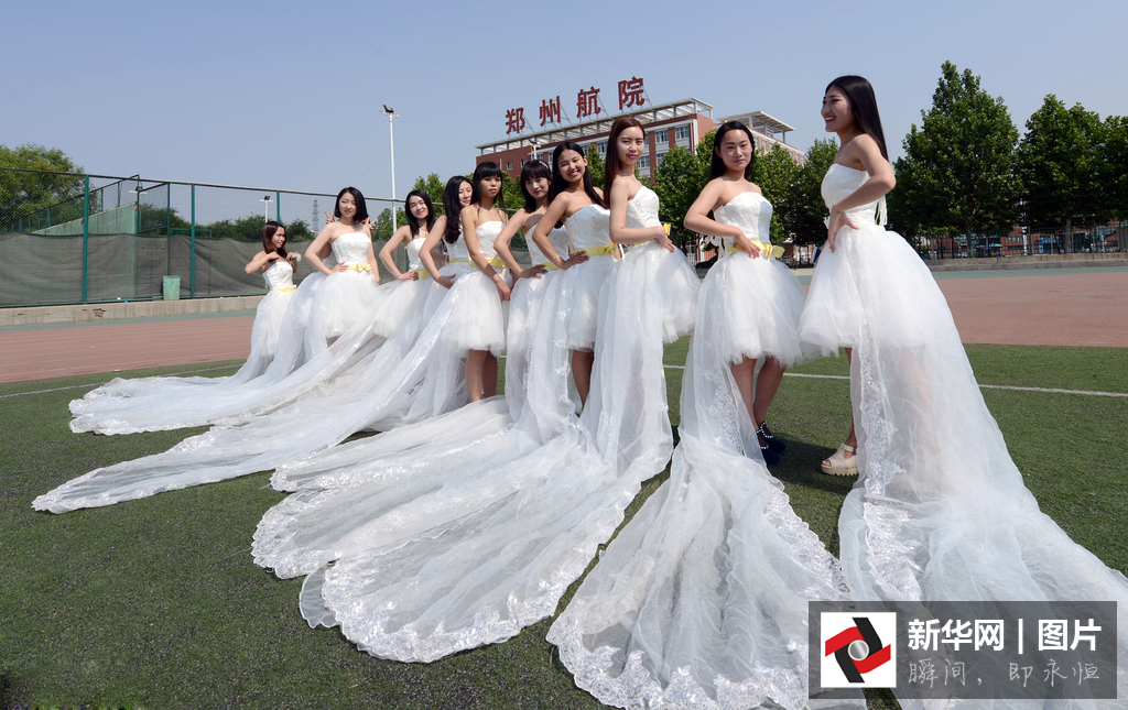 2016年5月22日,河南郑州,郑州航空工业管理学院的毕业生身穿婚纱在校园里拍照留念。图片来源:视觉中国