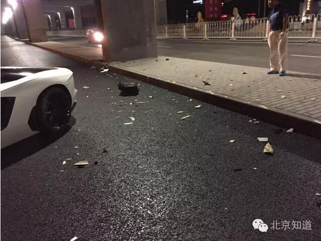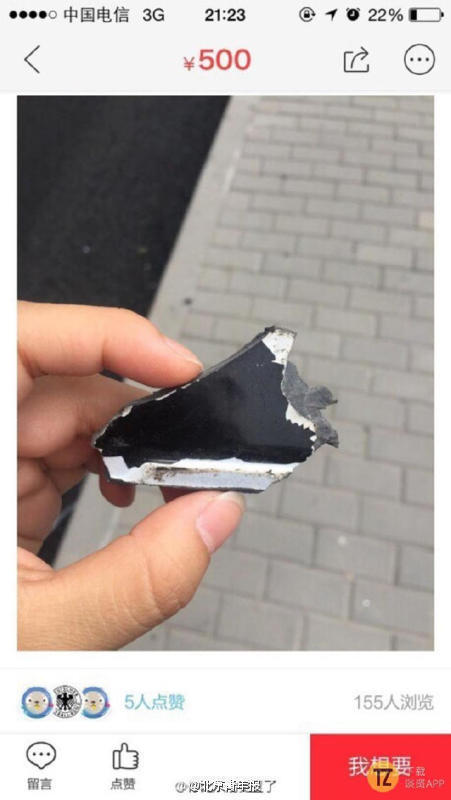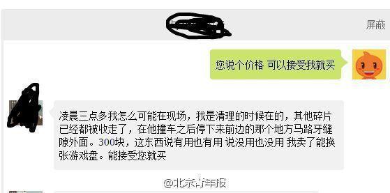 另外两张图片显示在事故现场,有两个手持摄影机的人正在拍摄。最引人注意的一张图片貌似是兰博基尼碎片,卖家称有3、5厘米长,大概为碳纤维材质,可以放在钱包里。卖家自称住在后现代城,距离事发现场特别近,但凌晨3点他并不在现场。碎片是第二天路过时在马路牙子的缝隙里捡到的。碎片仅此一块,卖价300,可当面交易。