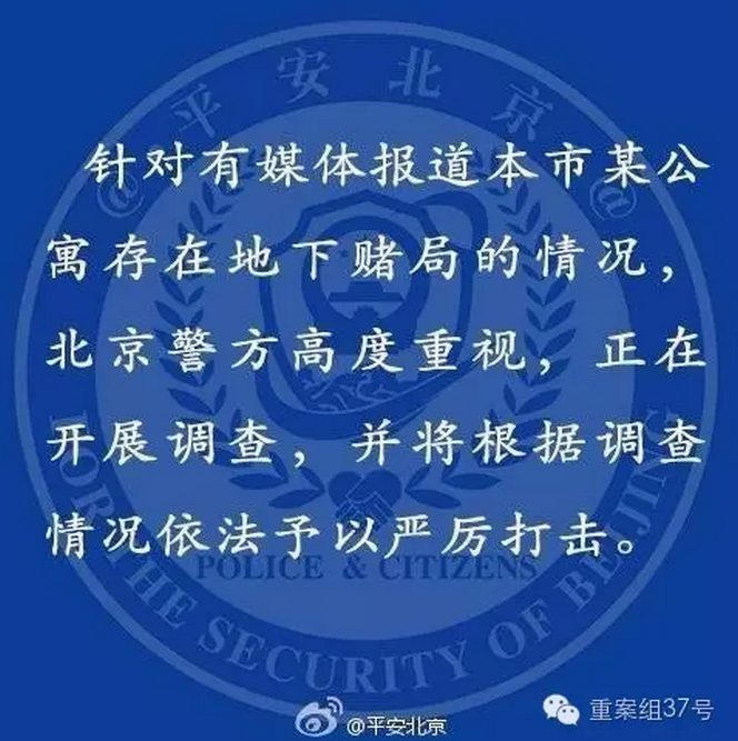 昨日一早,北京公安局官方微博@平安北京发布消息称,“针对媒体报道本市公寓存在地下赌局情况,北京警方高度重视,正在开展调查,并将根据调查情况依法予以严厉打击”。