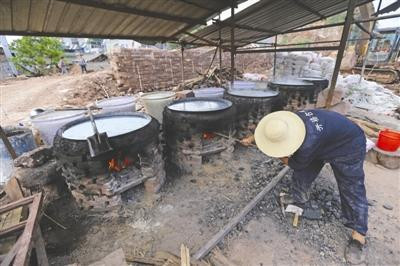 昨日,四川西昌,工人支起大锅熬制糯米浆 摄影记者 张建