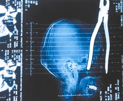 手钳把手深度插入脑部约15厘米,从颅顶贯穿眼部接近牙骨处,颅内有严重的骨折,已经出现颅内高压的情况。