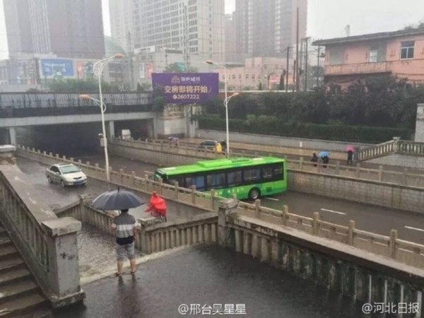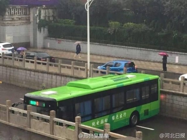 7月19日,河北邢台市区遭暴雨袭击,多处地道桥积水过多,使车辆无法通行。上午9时左右,一辆6路纯电动公交车,在要通过中兴路地道桥时,见势不妙,竟在入口处的狭窄道路上成功掉头返回,保证了车辆及车上乘客的安全。