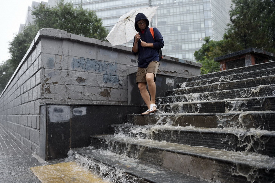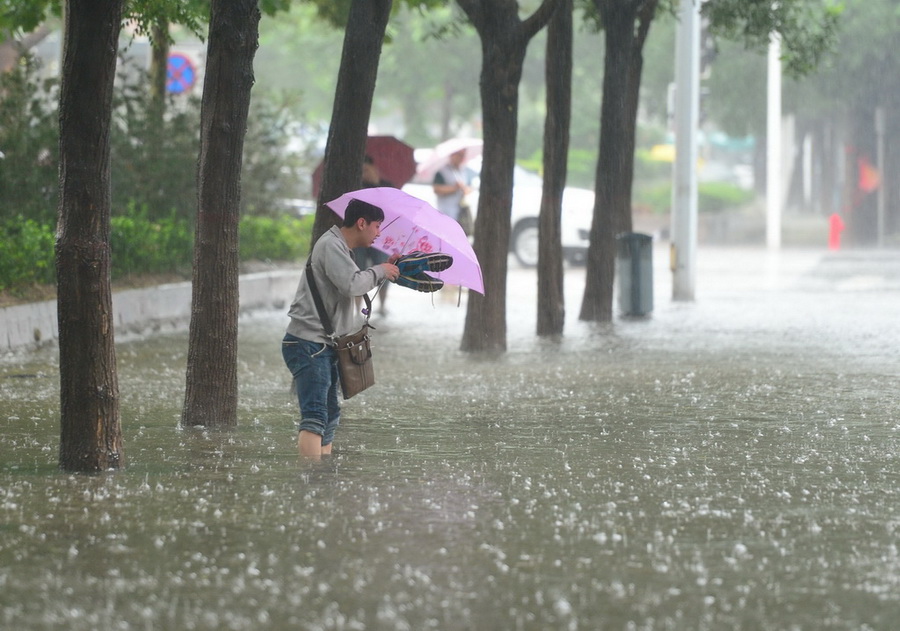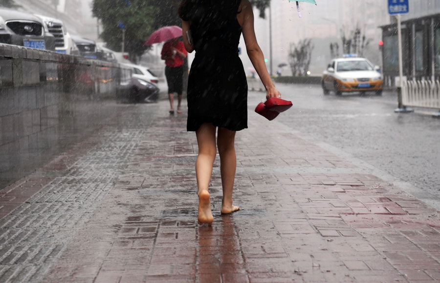7月20日,一位女孩在北京市广渠门附近光脚前行。北京市气象台7月20日8时40分更新发布暴雨黄色预警,预计20日本市大部分地区仍有暴雨、局地大暴雨。新华社记者金良快摄
