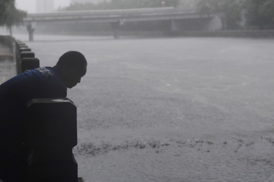 7月20日,北京城市排水集团员工观察北京广渠门附近的护城河水位。当日11时30分,北京市气象台发布暴雨橙色预警,目前城区及南部地区6小时累计降水量达70毫米左右,局地超过100毫米,预计至20日傍晚强降水持续。新华社记者 金良快 摄