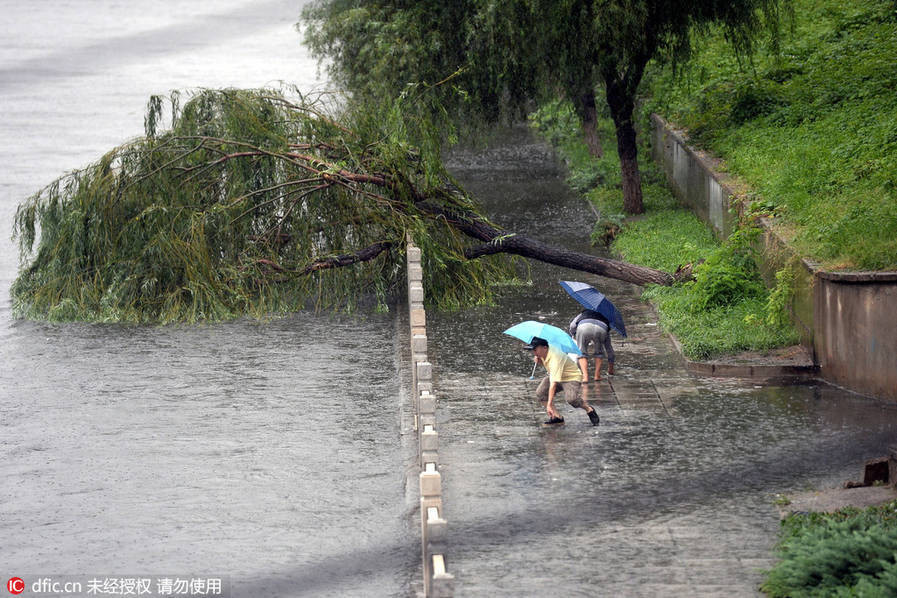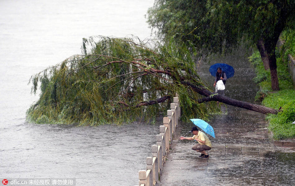 7月20日下午2点半左右,北京通惠河大望路河段两旁人行道上河水减退,“救鱼哥”孙先生下班经过,看见人行道上有许多搁浅的小鱼,便好心把鱼扔回河中,孙先生说:“小鱼也是生命,能救一条是一条。”潘之望/东方IC