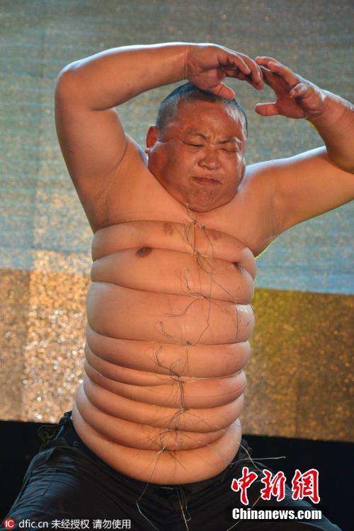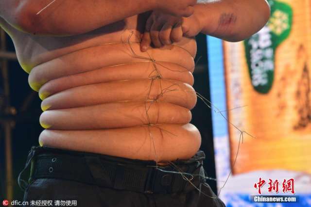 2016年7月22日,山东茌平,被业界称为“功夫之王”的山东省曹县籍人士威龙,在山东省第四届国际啤酒节上先后表演了气功断钢丝、钢刀垫臂开砖、头顶击砖等几项绝活,让在场的上千名观众见识了他的真功夫。
