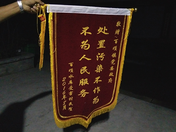 谢华白、冯继昌等村民说,他们多次向镇里、县里反映污染情况,政府部门也多次说整改,但一直没落实,于是,冯勇军就制了两面“不作为”锦旗。