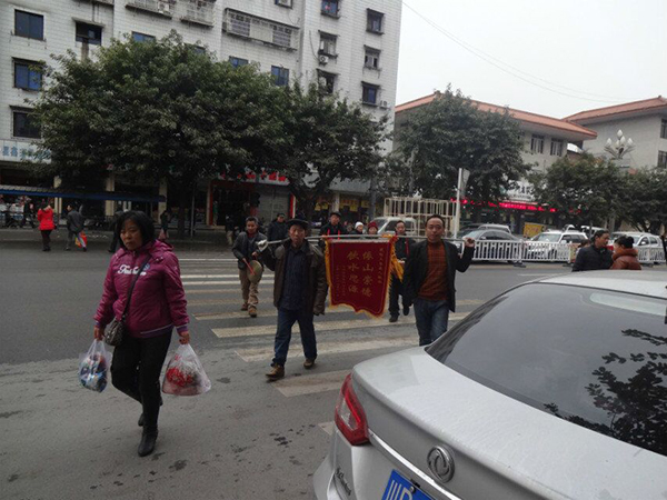 谢华白等人说,8月10日上午9时许,冯勇军等人先后从村里乘坐公交车或电瓶车赶到三台县城,当他们拿着锦旗走到县城车站附近时,9人被警察一起抓了。