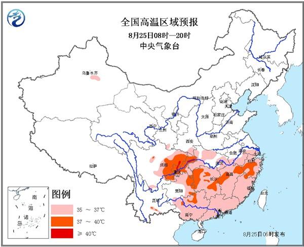 8月11日以来,南方高温持续,今天大范围高温天气将继续。为此,中央气象台继续发布了高温黄色预警,预计25日白天,四川盆地、重庆、江汉中部、江淮西南部、贵州北部和东部、江南大部、华南大部等地有35℃以上的高温天气,其中,四川盆地中东部、重庆大部、贵州东部、湖南西部和东南部、江西西部和东北部、浙江中南部、福建北部、广西北部等地的部分地区最高气温可达37~40℃。