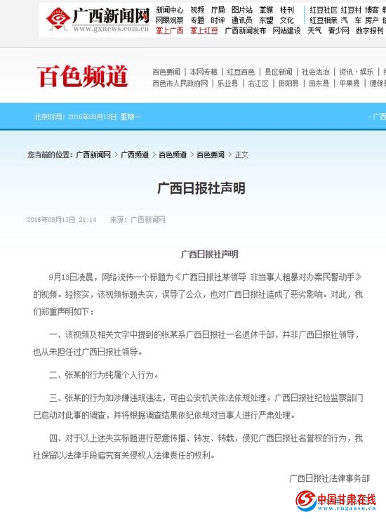 9月13日凌晨,网络流传一个标题为《广西日报社某领导 非当事人粗暴对办案民警动手》的视频。经核实,该视频标题失实,误导了公众,也对广西日报社造成了恶劣影响。对此,我们郑重声明如下: