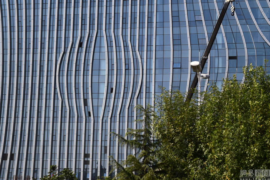 2016年10月14日,山东省青岛市,一幢正在建设的写字楼吸引了不少人的关注。这幢位于松岭路、株洲路路口的大楼设计风格独特,楼体玻璃幕墙上,本来笔直的隔栏在中间部位突然弯曲,形成一个类似“肚脐眼”的造型。