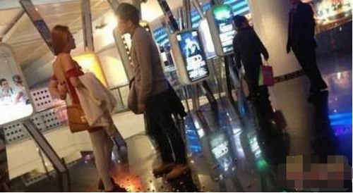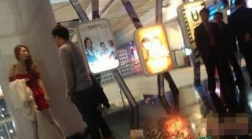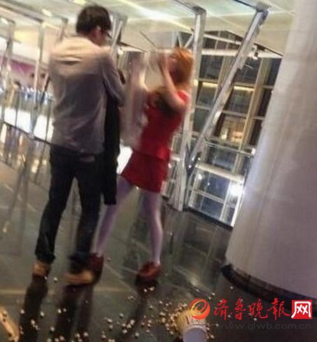 图为地铁站里,这对年轻情侣正在激烈的争吵,身穿红裙子的女子要和男友分手,手上的爆米花被女生重重的摔在地上,周围的人都惊呆了!