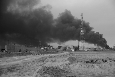 中国甘肃在线讯 10月17日,在伊拉克摩苏尔市南部盖亚拉镇拍摄的被“伊斯兰国”炸毁的油井冒出黑烟。新华社发