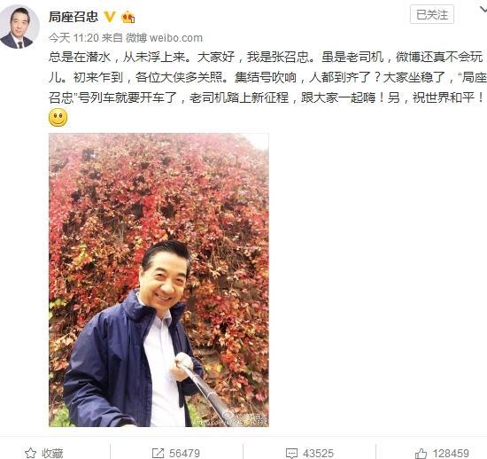 总是在潜水,从未浮上来。大家好,我是张召忠。虽是老司机,微博还真不会玩儿。初来乍到,各位大侠多关照。集结号吹响,人都到齐了?大家坐稳了,“局座召忠”号列车就要开车了,老司机踏上新征程,跟大家一起嗨!另,祝世界和平!(来源:搜狐网)