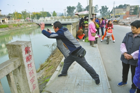 11月17日,成都市天回镇,出租车司机演示男子跳河时的场景。