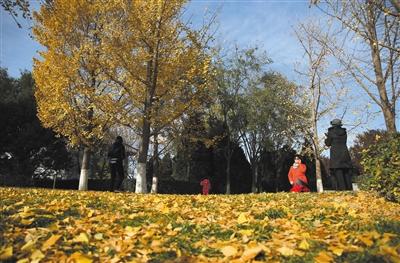 11月19日,国家大剧院,几位游客在落满银杏叶的草地上游玩,当天北京结束雾霾天气,迎来蓝天。新京报记者 薛珺 摄