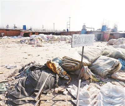 回收来的废旧衣物露天堆放在待加工区