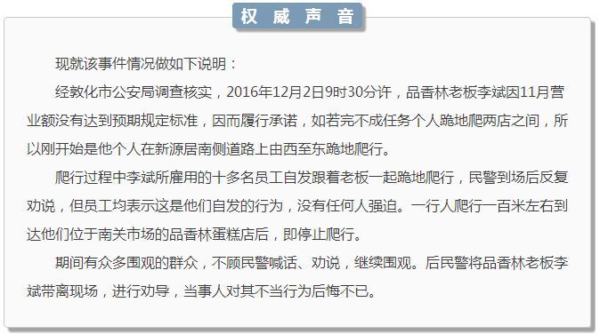 在视频后半段,画外音中有疑似该店员工回应说:“不是(老板)惩罚员工,是老板惩罚自己,只是我们员工看不下去了”,“我们员工跟着跪爬跟老板没有关系。”