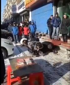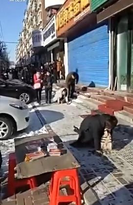 据新京报报道,这段长度约1分多钟的视频显示,在喧闹的叫卖声中,两男两女分作两排,在残留有冰雪的人行道上爬行。在爬行男女身后,有大量市民围观。