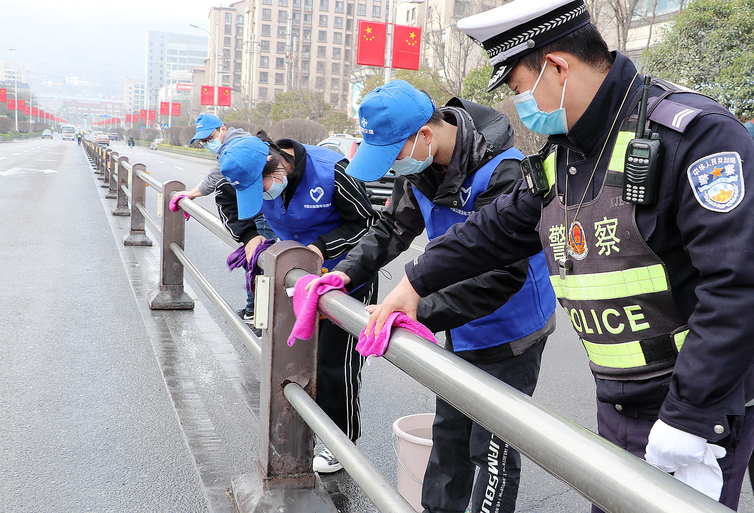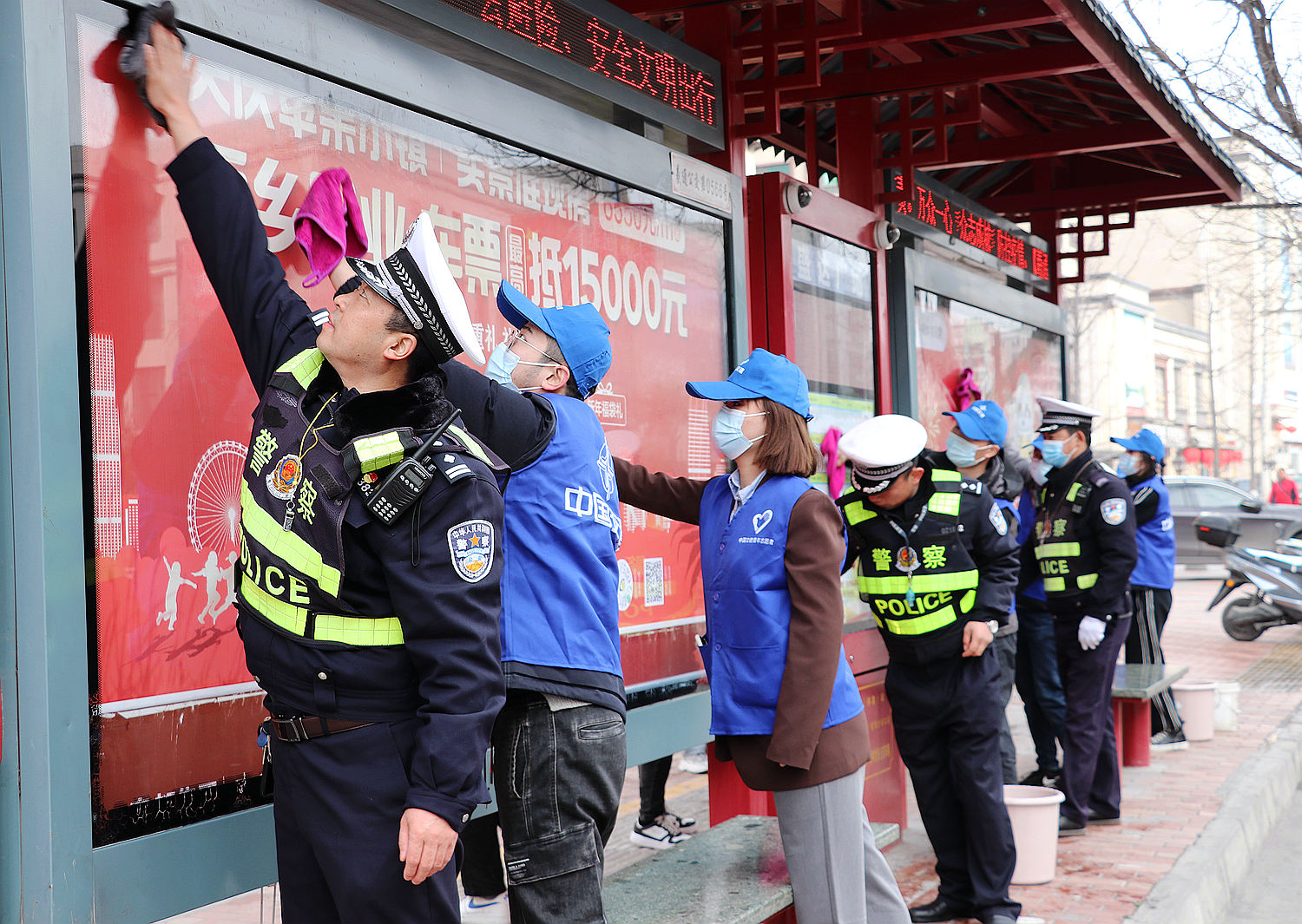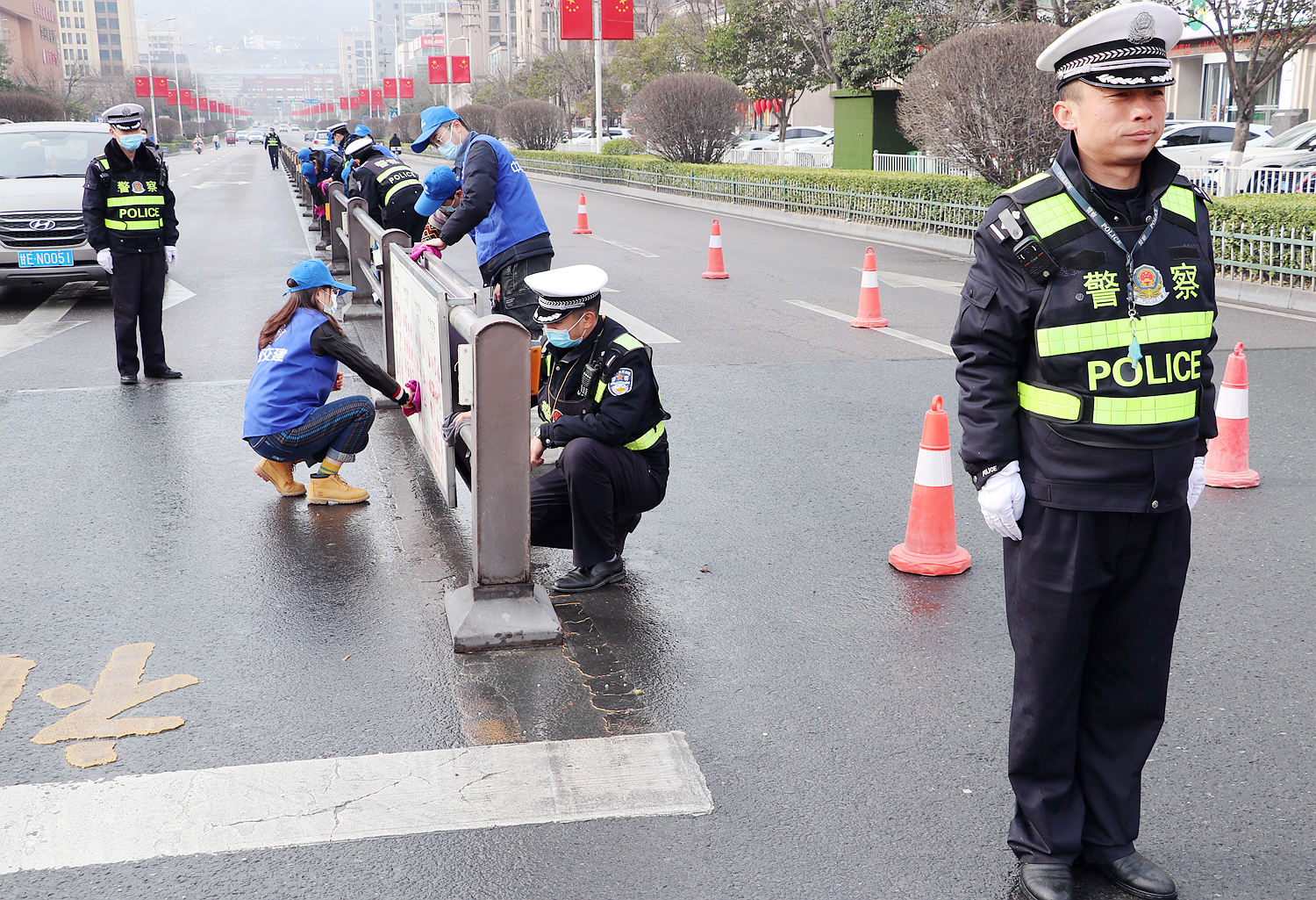 上午9时,着装统一的志愿者们跟随现场执勤民警早早来到了执勤岗位。全体志愿者用微笑迎接着每一个路过的行人和车辆,及时劝导行人和司机开车遵守交通规则。在帮助执勤民警维持交通秩序时,当发现电动车或行人欲闯红灯时,志愿者们立即上前耐心说服,及时纠正个别人员的交通违法行为;当遇到行人不走斑马线、非机动车违法停车时,志愿者们上前引导他们走斑马线,制止并劝导非机动车主自行驶离,同时民警志愿者一起对道路隔离栏、公交站进行清洁擦洗。