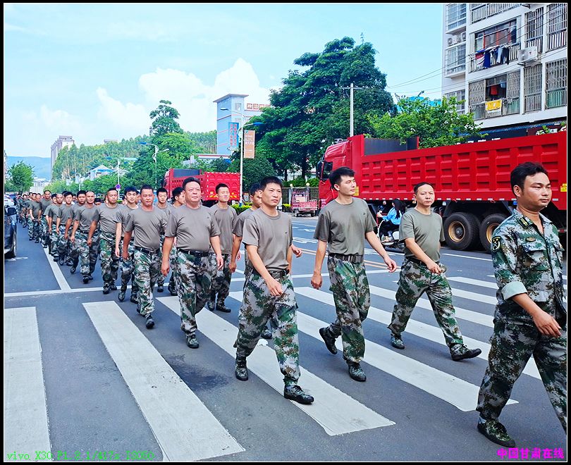 夏季天气炎热,7月10日,在广西融水苗族自治县武装部民兵训练场,正在操练的民兵汗流浃背,衣服浸湿了汗水又被高温晒干,大家顶着烈日认真进行站军姿、走队列等各个科目训练,没人叫一声苦。