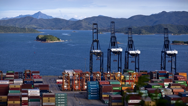 盐田港,码头上一堆堆彩色的集装箱中间,货车穿梭,映衬着蓝天白云,一片忙碌和繁荣景象。