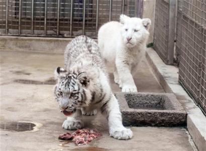 “我们在2012年5月13日引进一对白虎,属于幼年,一岁左右。”王宣华说,两只老虎之后曾经有过交配,但是没有顺利生产。今年7月14日,白虎夫妻首次生产,成功自繁两只幼仔。猛兽有时候容易出现弃崽的情形,不过令人感到高兴的是,虽然母白虎是第一次当妈妈,却很有耐心,一直给两只虎宝宝喂母乳。经过五六十天的母乳喂养,两只虎宝宝终于可以单独生活。昨天上午11时左右,两只虎宝宝迎来了吃饭时间,看到新鲜的牛肉,它们显得很兴奋,跑过去大口吃起来。“现在两只虎宝宝每天能吃3斤牛肉、10个鸡脖子,胃口不错。”王宣华说。据介绍,两只虎宝宝预计在春节前后与游客见面。(记者 王建亮 摄影报道)
