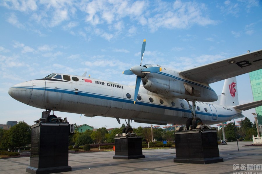 杭州萧山区的靖江镇政府办公楼前停的“运七”客机。
