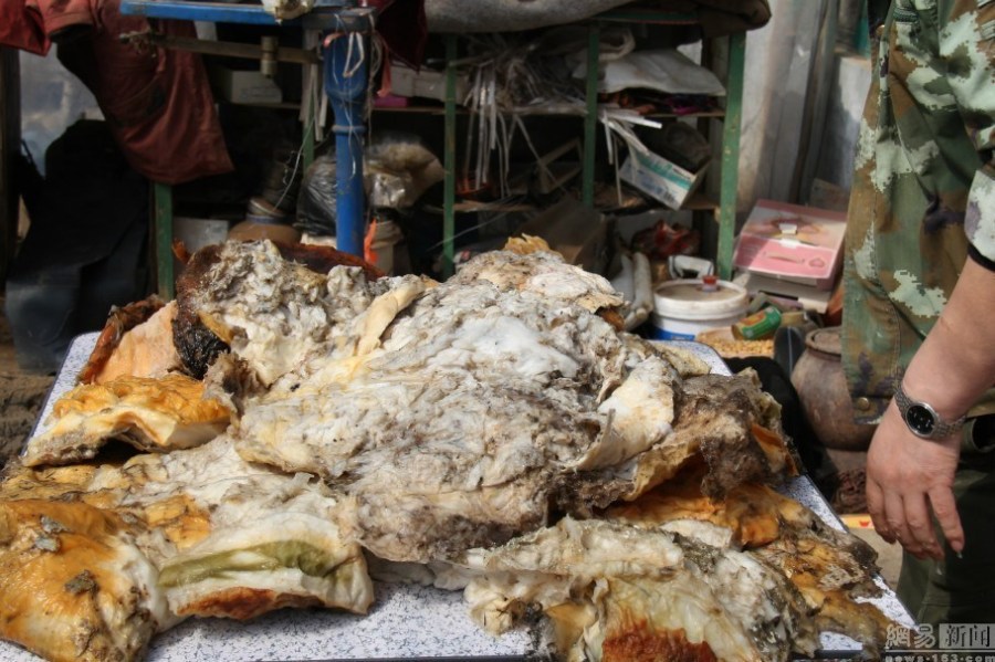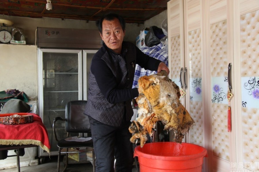 12月28日消息,2015年3月,辽宁东港市长安镇村民王成德在山上意外获得了140斤“太岁”。截至2015年12月28日,这颗140斤的“太岁”已经被售出60斤,每斤平均价格为一万元。“太岁”又称肉灵芝,是古人认为的长生不老仙药。现代科学家认为太岁是由粘菌、细菌和真菌三类菌构成的一种稀有的聚合体,而关于“太岁”的存在、作用和药效,在生物界始终有争议。图为村民王成德捞出“太岁”的一部分。
