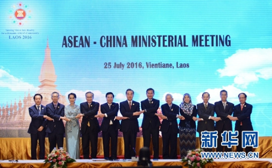 7月25日,在老挝首都万象,中国外交部长王毅(左六)和与会代表在会议开始前合影。当日,中国-东盟(10+1)外长会议在老挝首都万象举行。 新华社记者 刘昀 摄  中国与东盟国家外长发表联合声明强调《南海各方行...