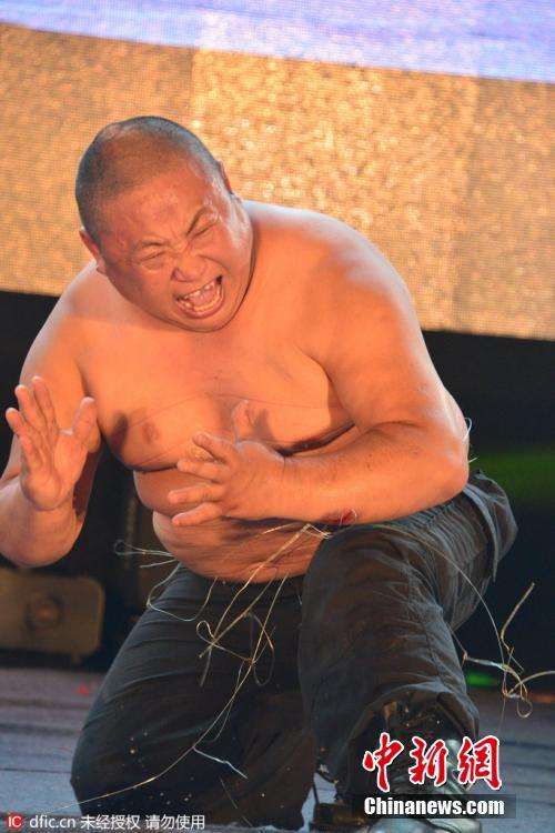 2016年7月22日,山东茌平,被业界称为“功夫之王”的山东省曹县籍人士威龙,在山东省第四届国际啤酒节上先后表演了气功断钢丝、钢刀垫臂开砖、头顶击砖等几项绝活,让在场的上千名观众见识了他的真功夫。...