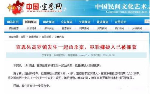 通报  楚天都市报 1 月 30 日讯 1 月 29 日,宣恩县高罗镇发生一起凶杀案,据了解,当日晚 7 时时许,犯罪嫌疑人滕某(男,41 岁,宣恩县李家河镇人)在高罗镇板辽村刘某(女)家中,将刘某的两个女儿(一个 8...