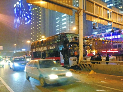 图为事发现场。见习记者孙笑天 双V记者徐厚伟 摄  本报讯(见习记者孙笑天 双V记者徐厚伟)昨晚,一辆583路双层公交车由汉口开往武昌方向,在长江二桥下桥与上岳家嘴高架桥接合处,撞上高架桥限高架,车上多名乘...