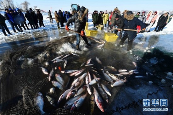 12月27日,在哈尔滨市道里区长岭湖,捕鱼农民从网中捞鱼。新华社记者王建威 摄12月27日,在哈尔滨市道里区长岭湖,一名游客拿起一条刚打上来的大鱼。新华社记者王建威 摄  捞上来大鱼。  捕鱼农民在收网。  12...