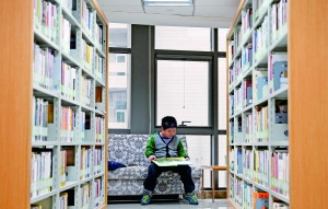 昨日,在北京一家公司的图书室,一名小朋友在看书。当日,学校停课,有些孩子因无人照顾,家长带着孩子去上班。   首席摄影记者 蔡代征/摄  部分学校远程视频上课  学校落实停课不停学比较到位  空气重污...