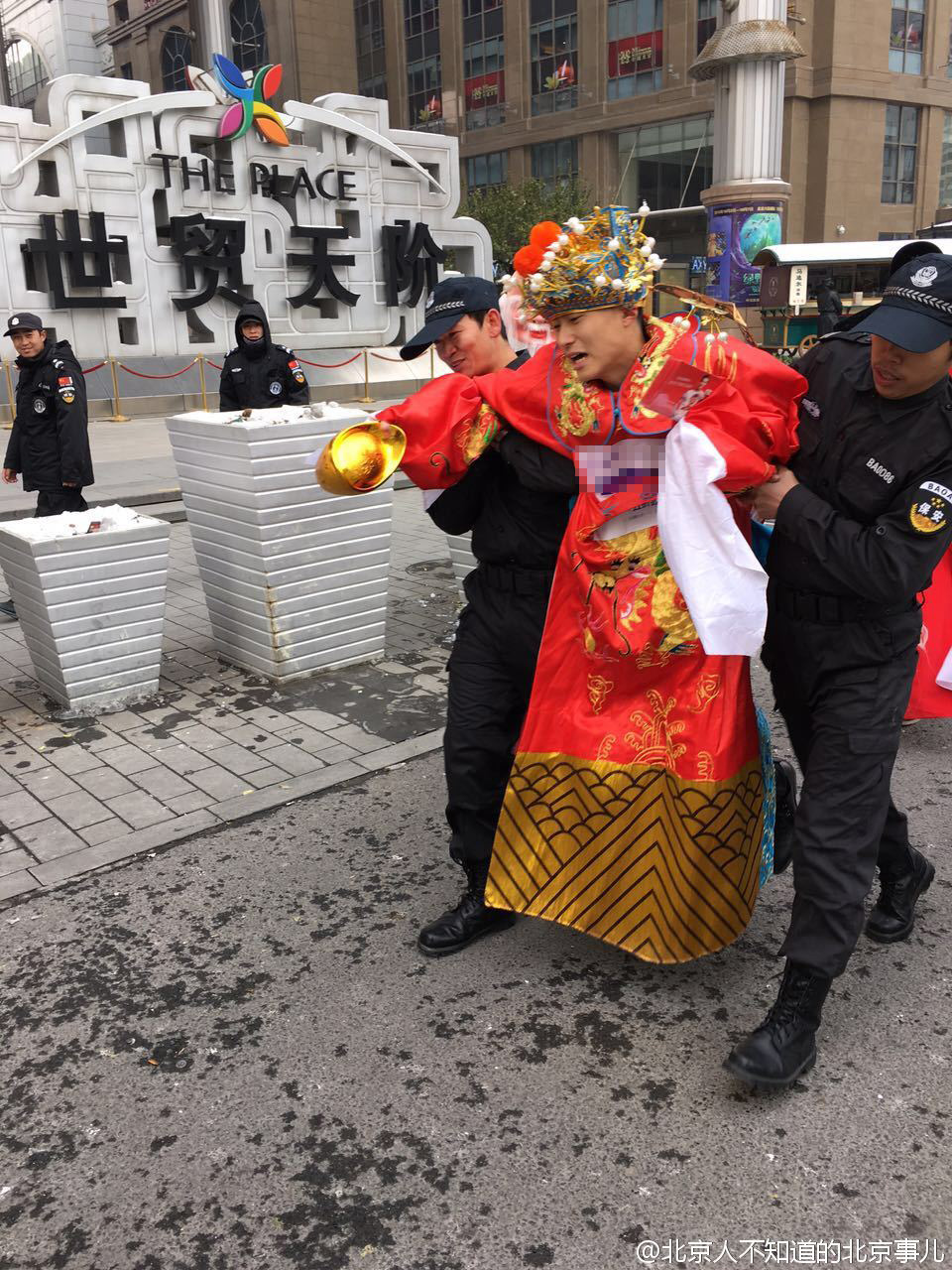 【现场】北京世贸天阶,几个扮演财神的人在发红包,发着发着就被赶来的保安架走了。  【现场】北京世贸天阶,几个扮演财神的人在发红包,发着发着就被赶来的保安架走了。  【现场】北京世贸天阶,几个扮演财...