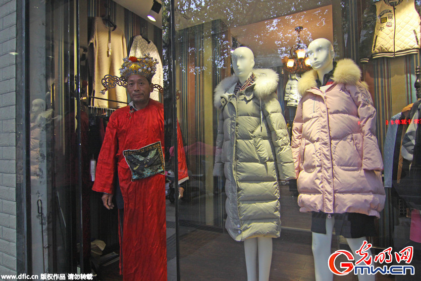 2015年11月20日,湖北省襄阳市,一名男子装扮成财神爷模样在荆州街向临街商铺乞讨要钱。男子装扮成财神爷模样湖北襄阳:一男子扮财神爷沿街进店讨红包...