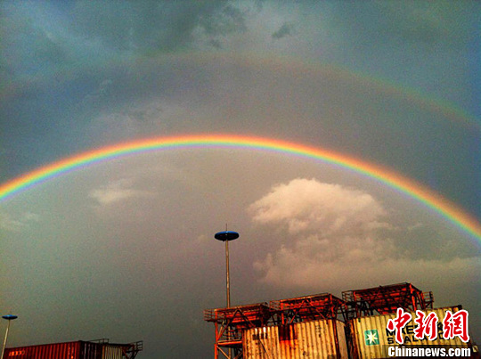 11月20日,一阵“太阳雨”过后,广西省北海市的上空出现“双彩虹”奇观。两道彩虹犹如一座美丽的大桥横跨天空,蔚为壮观。中新社记者 余秋海 摄...