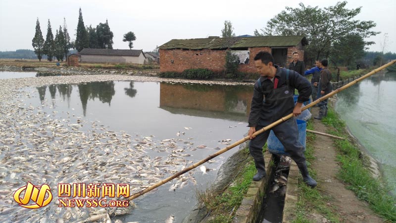 打捞死鱼   6万多斤鱼一夜死光  四川新闻网德阳10月27日讯(记者 周鸿 摄影报道)6万斤即将上市的鱼一夜之间遭“洗白”,让德阳鱼农肖继松一家难以缓过气来,他们怀疑是被投毒。四川新闻网记者获悉,目前,当...